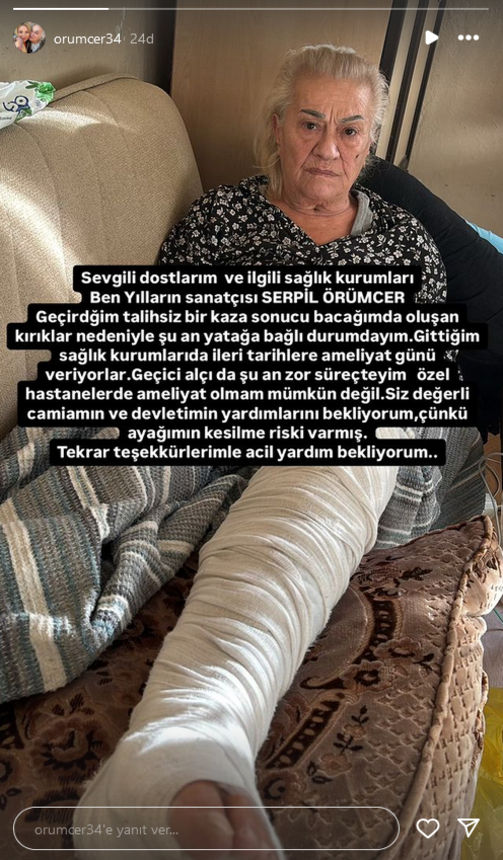 Serpil Örümcer; “Sevgili dostlarım ve ilgili sağlık kurumları. Ben yılların sanatçısı Serpil Örünmcer. Geçirdiğim talihsiz bir kaza sonucu bacağımda oluşan kırıklar nedeniyle şu an yatağa bağlı durumdayım. Gittiğim sağlık kurumları da ileri tarihe ameliyat günü veriyorlar. Geçici alçıda şu an zor süreçteyim. Özel hastanelerde ameliyat olmam mümkün değil. Siz değerli camiamın ve devletimin yardımlarını bekliyorum. Çünkü ayağımın kesilme riski varmış. Tekrar teşekkürlerimle, acil yardım bekliyorum” dedi.